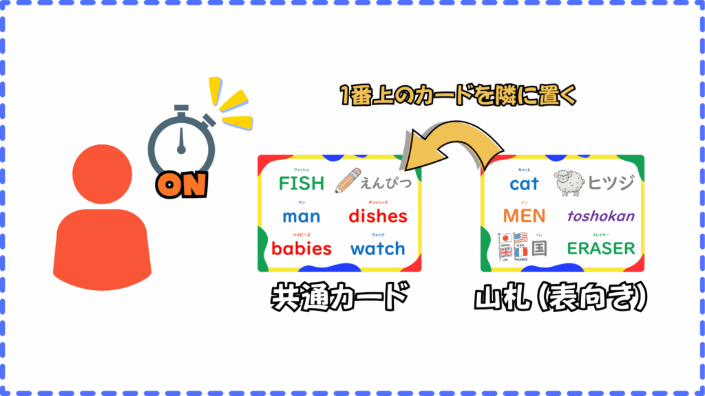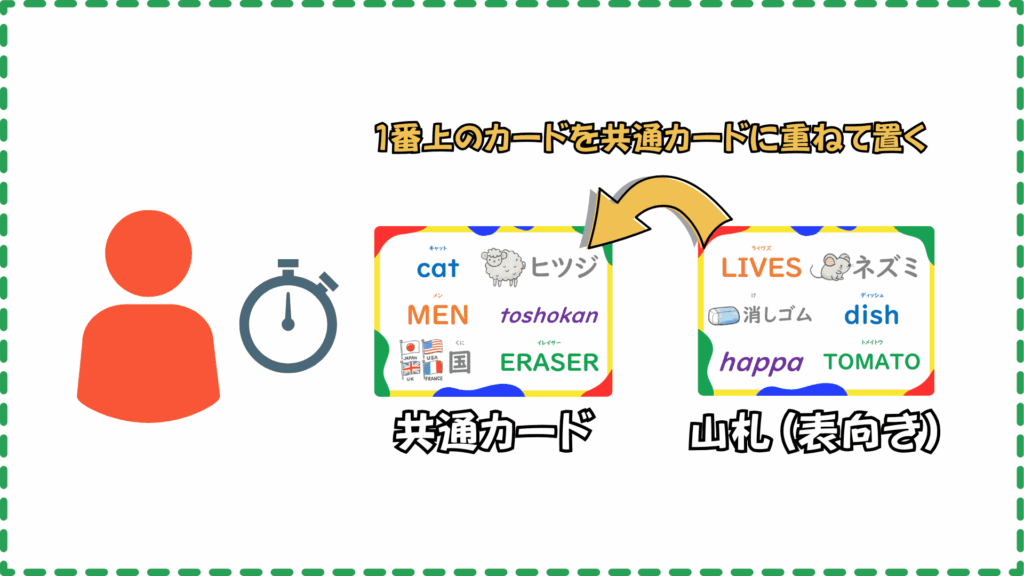 1:『共通カード』と『山札の1番上のカード』を見比べ、共通の1語を探します。