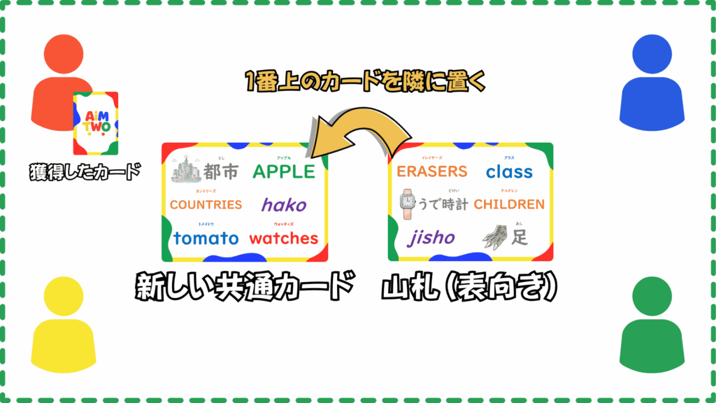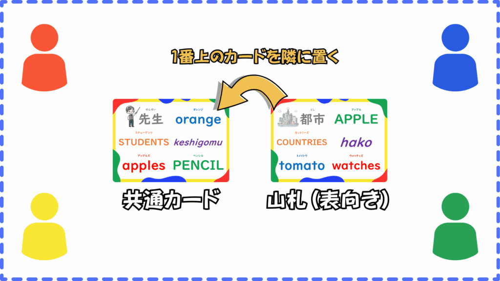 4:山札の1番上のカードを表向きのまま山札の隣に置き、新しい『共通カード』とします。