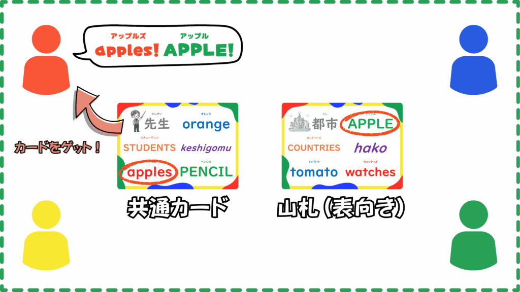 2:共通の1語を見つけたら、その単語を声に出して宣言します。最も早く宣言した人が『共通カード』を獲得します。