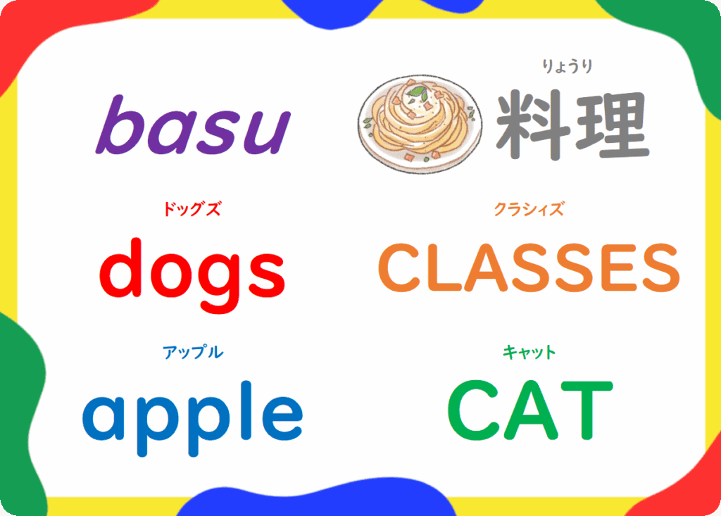 単数形(小文字)』『単数形(大文字)』『複数形(小文字)』『複数形(大文字)』『ローマ字(日本語のローマ字表記)』『黒:日本語