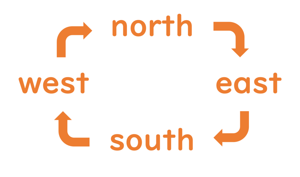 方角(north, east, south, west)の場合は、地図上で『90度左側の語』『90度右側の語』となります。